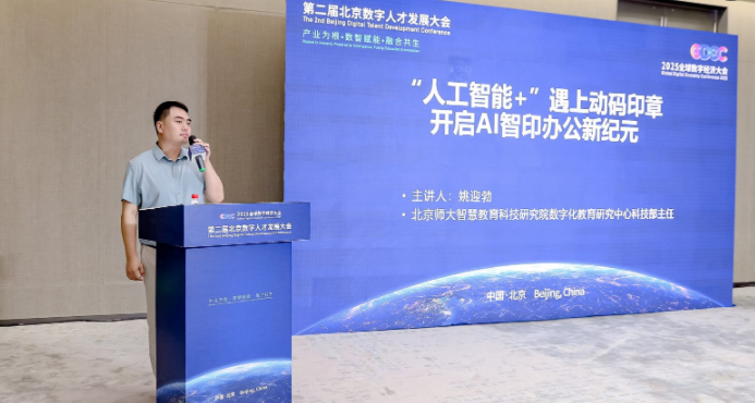 大会举办多场“AI+”主题平行会议,在“数智赋能,融合共生——构建人才发展新生态”为主题的“AI+人才发展”分论坛上,北京师大智慧教育科技研究院数字化教育研究中心科技部主任、矩网科技有限公司(以下简称矩网科技)解决方案总监姚迎勃受邀,以“‘人工智能+’遇上动码印章,开启AI智印办公新纪元”为主题进行演讲,与数字经济领域主管部门领导、专家学者、重点企业代表等汇聚一堂,共同探索和实践人工智能赋能教育领域和人才发展的新模式、新路径。