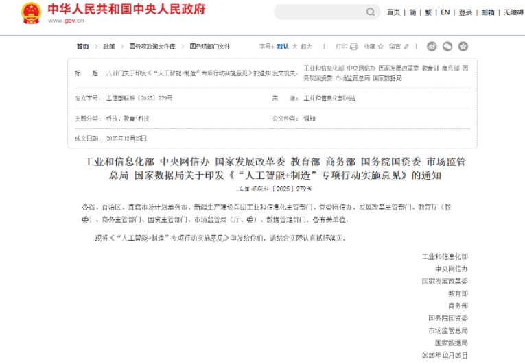 近日,工业和信息化部、中央网信办、国家发展改革委、国务院国资委、市场监管总局、国家数据局等八部门联合印发《“人工智能+制造”专项行动实施意见》(以下简称《意见》)。