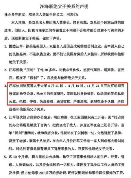 声明控诉儿子汪军、儿媳徐英多次有组织有预谋地抢夺公司公章、伪造汪海签名私刻公章,双方在近些年围绕企业控制权开展多轮交锋,登报声明、法庭诉讼轮番上阵,上演一场现实版“权力的游戏”。